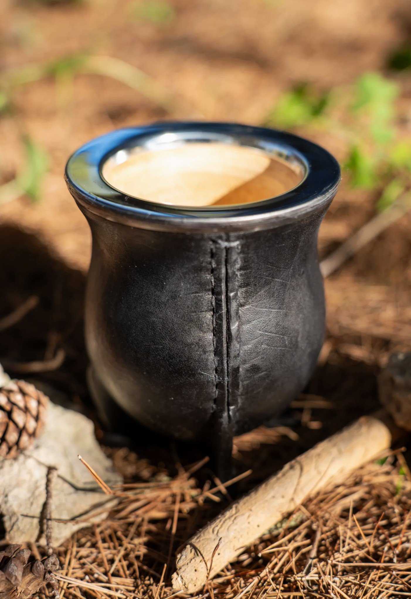Made from natural gourd and covered in high-quality black leather, this mate cup features a stainless-steel rim (virola) that adds durability and a bold, elegant look. The Camionero shape offers a wider mouth and sturdy base, making it comfortable to hold and ideal for sharing mate with friends.